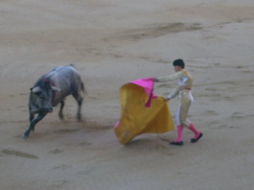 The matador tries to dominate and tire the bull with hypnotic cape work. With each pass, the matador thrusts barbs/swords into the bull's neck.