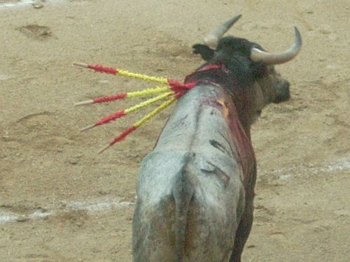 The bull with brightly colored barbed sticks plunged into its vital neck muscle