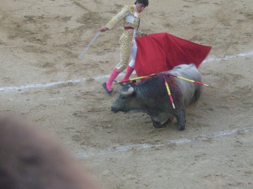 The bull stumbles in weakness...